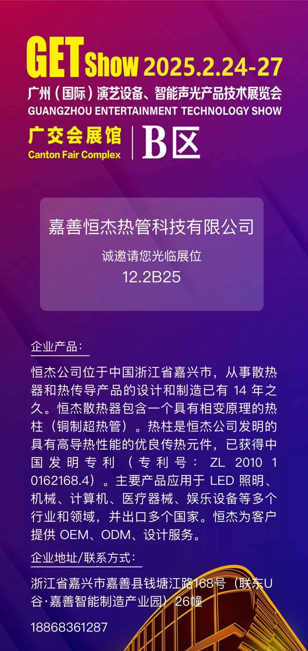 嘉善恒杰热管科技将携最新舞台灯、摄影灯、投影灯散热器等散热解决方案亮相本次展会,展示企业在声光电散热领域的创新成果。