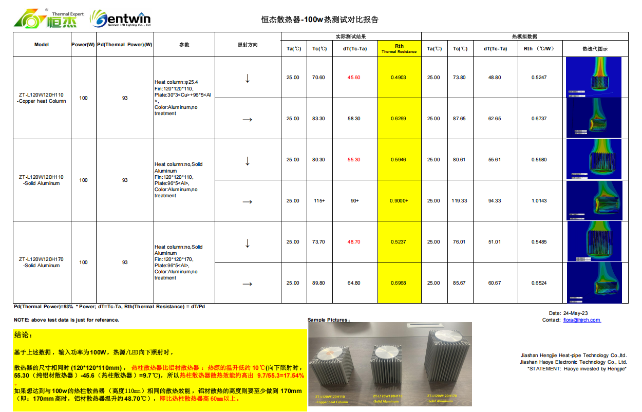 若要在同等功率下达到与热柱散热器(高度110 mm)相近的温升(约45.6 ℃),纯铝散热器的高度需增至170 mm以上,即高度需增加超过60 mm。