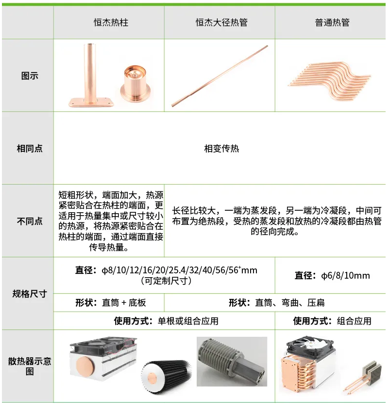 相较于普通热管散热器,热柱无需折弯、压扁等加工,避免了因此造成的导热能力下降,也消除了热管常见的“无效端”,可实现全角度安装使用(热管因长径比大,逆重力使用性能会大幅下降)。